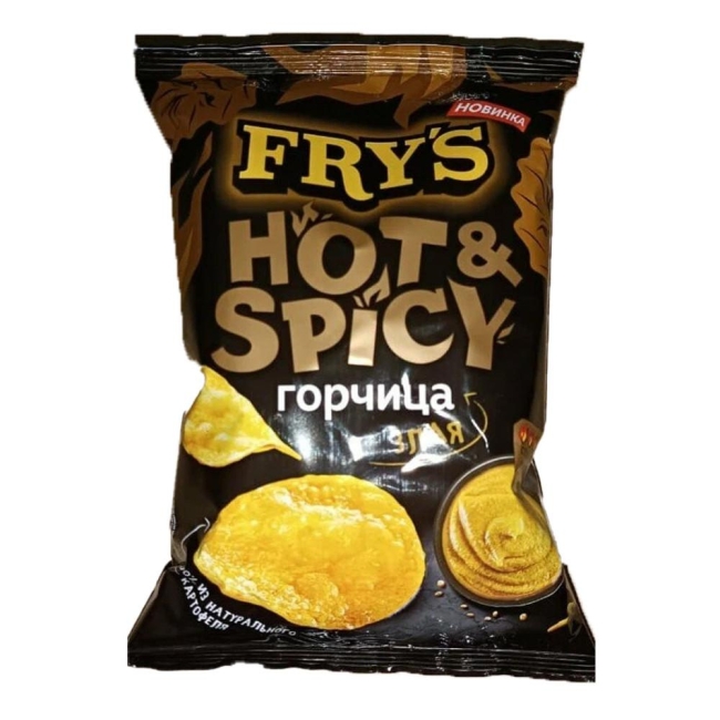 Состав: картофель натуральный, масло растительное, ароматизатор (соль, сахар, усилители вкуса и аромата (глутамат натрия 1-замещенный, 5'-гуанилат натрия 2- замещенный, 5'-инозинат натрия 2-замещенный), лук порошок, регуляторы кислотности (ацетаты натрия, лимонная кислота, винная кислота), горчичный порошок, специи, натуральные вкусоароматические вещества, вкусоароматические вещества, жир растительный, краситель куркумин, агент антислеживающий диоксид кремния аморфный), регулятор кислотности Е32