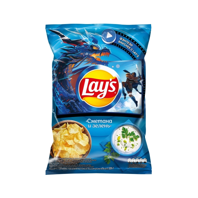Картофель, растительное масло, ароматизатор [соль, вкусоароматические вещества (луковый порошок, листья петрушки, чесночный порошок, сырный порошок, сметанный порошок), сухая молочная сыворотка, сахароза, усилитель вкуса и аромата (глутамат натрия 1-замещенный)]
