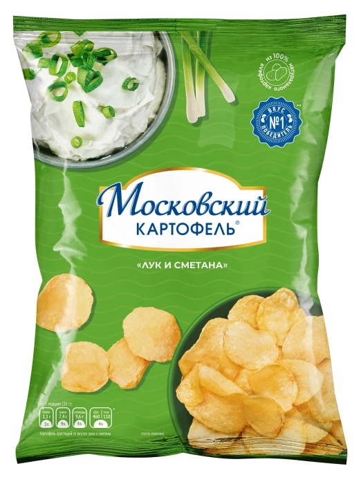 Чипсы картофельные МОСКОВСКИЙ КАРТОФЕЛЬ со вкусом лука и сметаны отличаются хрустящей текстурой и приятным насыщенным вкусом. Такой продукт составит удачное сочетание с прохладительными напитками и может использоваться в качестве быстрого перекуса. Он хорошо насыщает и заряжает энергией, тонизирует и восстанавливает силы.