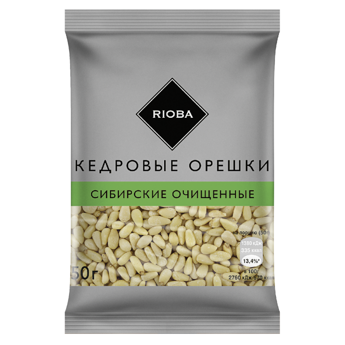 RIOBA Кедровые орешки очищенные 50 г – отличная добавка к салатам, соусам и основным блюдам. Они содержат белок, который быстро усваивается, а также большое количество микроэлементов, включая фосфор, медь, марганец и калий. В продукте присутствуют витамины Е, PP, B1, B2. В составе есть тиамин, который поддерживает память и улучшает настроение, и рибофлавин, повышающий иммунитет. Большое количество полезных веществ способствует улучшению состояния кожи, волос и ногтей