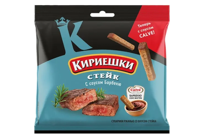 В пачке 60 г сухариков и упаковка соуса барбекю «Calve» 25 мл.