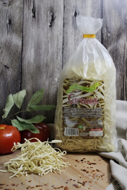 Состав: мука пшеничная в/с, вода, яйцо куриное, Эмульгатор — лецитин соевый, натуральный краситель - Бета-каротин.