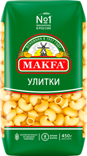 Улитки MAKFA – натуральный продукт из твердых сортов пшеницы. Подходит для приготовления гарниров, запеканок и супов. Универсальный ингредиент для сытного обеда и легкого ужина, прекрасно сочетается с овощами, мясом и рыбой.