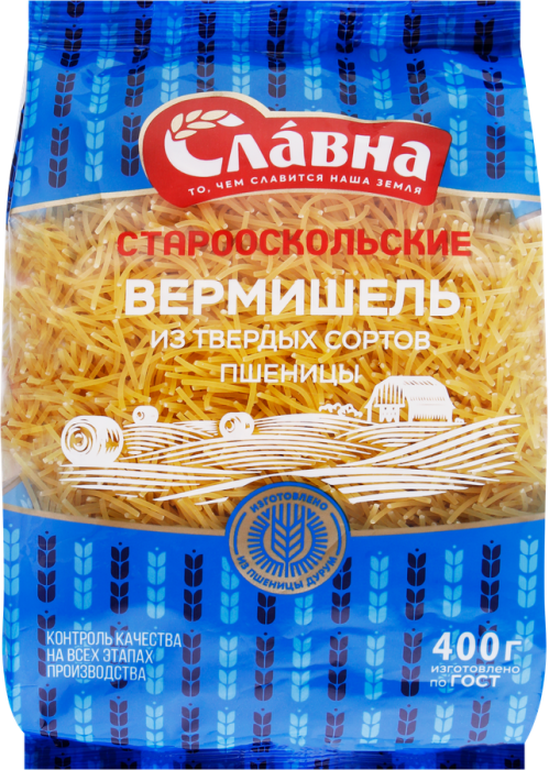Макароны СЛАВНА Вермишель группа А, высший сорт изготовлены из твердых сортов пшеницы. Включение такого продукта в рацион полезно для здоровья. Он богат витаминами, микро- и макроэлементами. Макароны хорошо насыщают, легко усваиваются, улучшают пищеварение, регулируют уровень холестерина и сахара в крови.