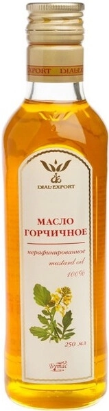 Диал-Экспорт, Масло горчичное — нерафинированное натуральное масло, изготовленное из семян горчицы без использования консервантов и красителей. Горчичное масло стимулирует пищеварение и повышает аппетит, также оно является природным антибиотиком, рекомендуется для профилактики сердечно-сосудистых заболеваний, укрепляет стенки сосудов. Масло обладает острым ароматом и пикантным вкусом. Оно идеально подходит для приготовления традиционных блюд русской кухни: винегретов, блинов, пирожков, картофеля