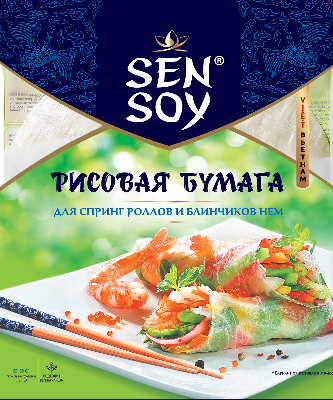 Рисовая бумага "Sen Soy Premium" готовится из теста на основе риса и воды, с добавлением соли. Готовые листы сушат на солнце, разложив на бамбуковых циновках, характерный рисунок от которых отпечатывается на каждом листе. Хрупкая и ломкая в сухом виде, она очень проста в приготовлении – достаточно размочить листы в холодной воде в течение минуты и можно смело заворачивать начинку в ролл. Рисовая бумага – уникальный диетический продукт, который не содержит жиров и сахара.