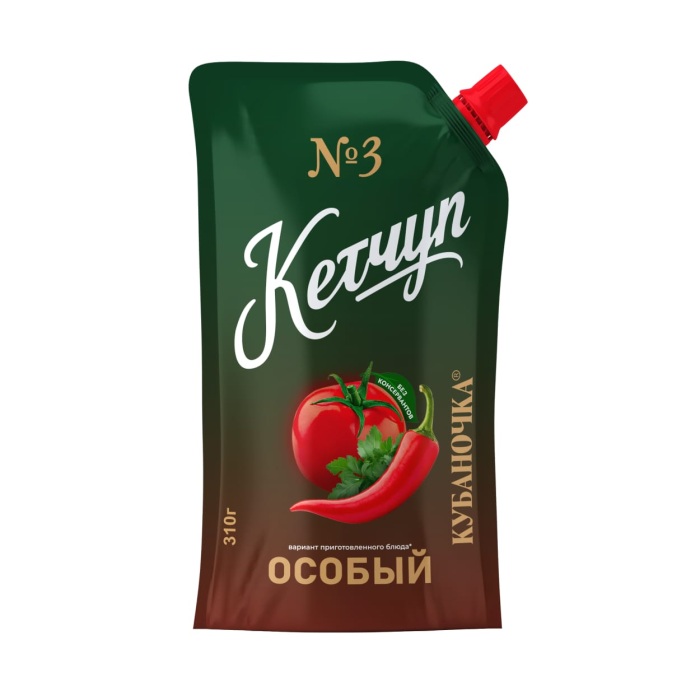 Кетчуп №3 особый «Кубаночка» - самый яркий и нетипичный вкус кетчупа!Кетчуп №3 особый станет яркой изюминкой для мясных блюд, паст, пицц, авторских соусов и не только.Он понравится вам не только за вкус и приятный аромат, но еще и за высокое содержание эфирных масел, железа, фосфора, цинка, витаминов Е, А, С.