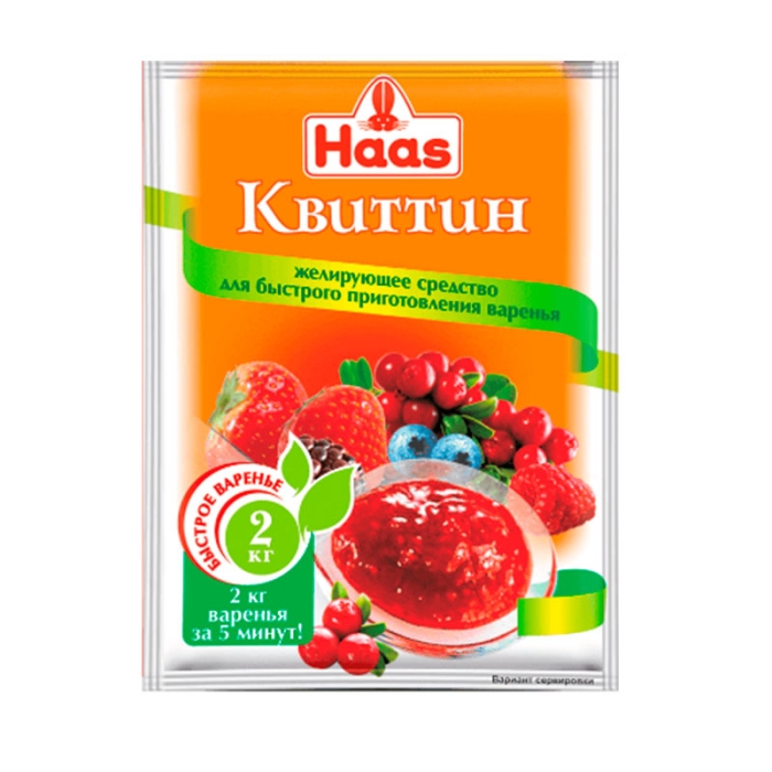 Квиттин HAAS создан на основе натурального пектина, который содержится в фруктах и овощах. Его добавляют при варке варенья, джемов, повидла, чтобы продукт приобрел яркий цвет и желаемую консистенцию. Применение квиттина HAAS сокращает время приготовления варенья и джемов, сохраняет цвет ягод и фруктов, сохраняет их целыми в варенье, они не развариваются. Кроме того, при использовании квиттина получается больше готового продукта.