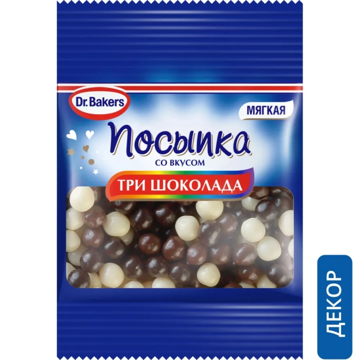 Мягкая хрустящая посыпка, покрытая кондитерской глазурью, со вкусом "Три шоколада" - белого, молочного, тёмного. Посыпка не тает и сохраняет форму, позволяя создать красивый декор для вашего изделия. С новыми посыпками от Dr. Bakers процесс приготовления выпечки и декора станет еще более творческим и ярким!
