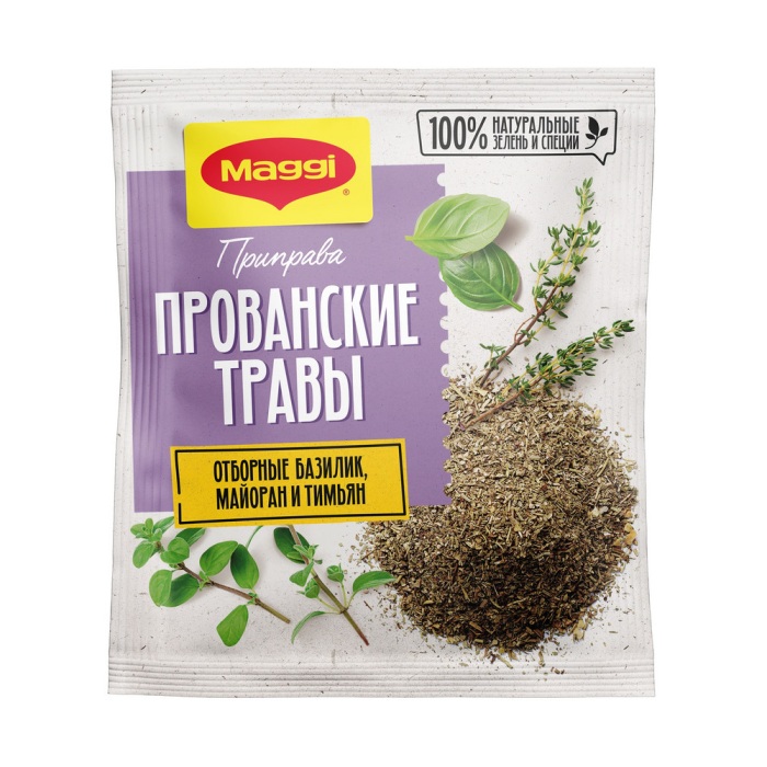 Травы сушеные и специи молотые (базилик, майоран, тимьян, кориандр, чеснок, розмарин, чабер, орегано, лавровый лист, кумин, пажитник, имбирь, перец черный), соль йодированная (соль, йодат калия), масло подсолнечное. Продукт может содержать молоко, глютен (из злаков), сельдерей.