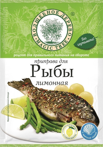 Приправа содержит ароматные травы, пряности, натуральный экстракт чеснока, лимонную цедру и сок в оригинальном сочетании для приготовления любой морской и речной рыбы.