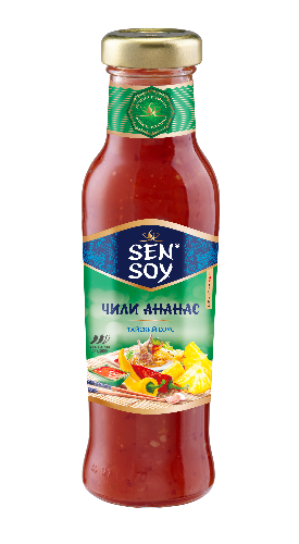 Кисло-сладкий ананас и острый жгучий чили составляют в Тайском соусе Чили Ананас Сэн Сой Премиум неповторимый букет вкуса, который прекрасно сочетается с самыми разнообразными продуктами – начиная от лосося и заканчивая сладкими фруктами.