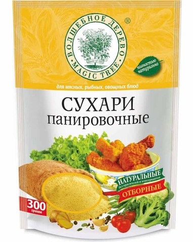 Панировочные сухари "Волшебное дерево" - это хлебная крошка, изготавливаются по специальной рецептуре: сразу, как панировка. Название «панировочные сухари» происходит от французского слова «paner», что означает посыпать хлебной крошкой Мы не измельчаем панировочные сухари из готового хлеба. Это позволяет создать равномерную, аппетитную, хрустящую золотистую корочку, которая не размокает, но сохраняет вкус, аромат и сочность продукта. Наши сухари можно использовать, как панировку для курицы, нагг