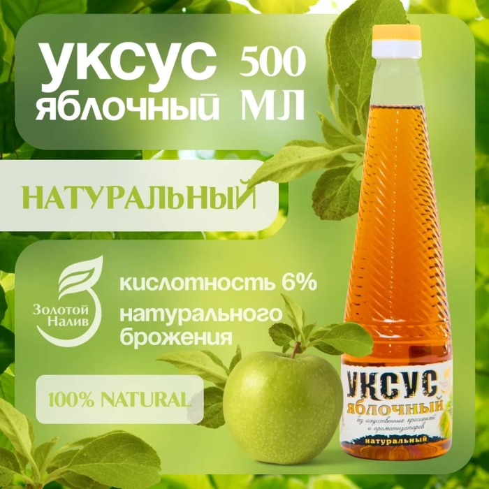 Яблочный уксус “Золотой налив” - уксус натуральный, приготовлен по традиционной рецептуре из отборных яблок, собранных в экологически чистых регионах юга России.