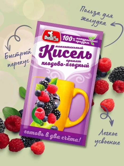 Моментальный кисель Preston - это вкусный и питательный напиток, который станет отличным дополнением к вашему столу. В его составе отсутствуют ГМО, искусственные добавки и красители, что делает его безопасным для здоровья взрослых и детей.