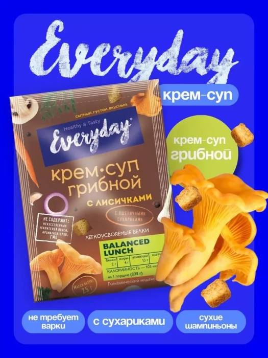 Грибной суп пюре с лисичками и сухариками Everyday - горячее быстрого приготовления в пакете для тех, кто придерживается тренда на здоровое питание. Пакеты быстрого приготовления удобно брать с собой в офис, на учёбу или в путешествие.