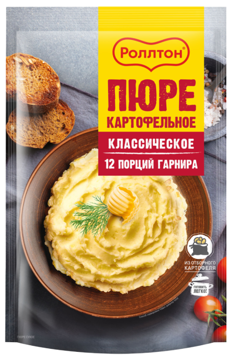 Картофельное пюре – один из самых любимых гарниров, особенно когда это пюре – «Роллтон». Чтобы вы ни выбрали: мясо, рыбу, птицу или овощи – с ним всё станет еще вкуснее. Экспериментируйте, а большая упаковка поможет исполнить любые гастрономические идеи.