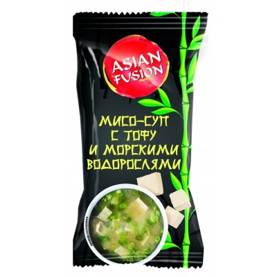 Мисо-суп с тофу и морскими водорослями ASIAN FUSION - суп быстрого приготовления из сыра тофу и морских водорослей. В составе только натуральные продукты: паста мисо, водоросли ламинария сушеная, соевый сыр тофу, специи и зелень.