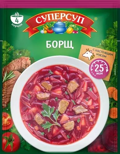 Борщ с мясом – любимое блюдо практически у каждого человека. Приготовить его по традиционному домашнему рецепту, не затратив много времени, поможет СУПЕРСУП. Натуральные овощи, настоящая говядина, зелень и приправы - все, что нужно для полноценного обеда.