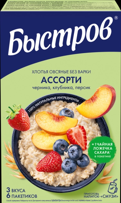 Хлопья овсяные БЫСТРОВ Ассорти, с черникой, с клубникой и с персиком предназначены для быстрого приготовления каши. Такое блюдо богато клетчаткой, витаминами из группы В и С, антиоксидантами, кремнием, калием, йодом и другими микро- и макроэлементами. Каша из овсяных хлопьев надолго избавляет от голода, заряжает энергией, нормализует работу желудка и кишечника, способствует выводу токсинов.