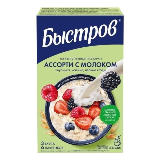 Хлопья овсяные из цельных злаков (72,6%) (содержат глютен (клейковину)), сахар, сыворотка молочная сухая, сухое цельное молоко (2,7%), клубника (1,9%), соль морская, натуральный ароматизатор. Продукт может содержать орехи, малина (1,6%), лесные ягоды (1,8%) (ежевика, черная смородина, черника, малина).