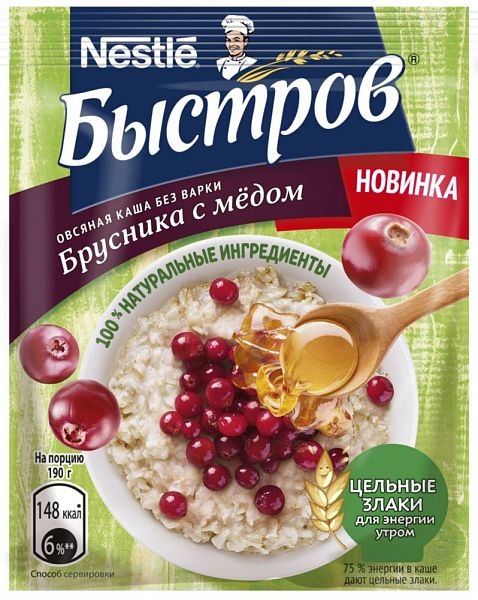Каша быстрого приготовления состоит из: хлопья овсяные из цельных злаков (75,3%) (содержат глютен (клейковину)) , сахар, брусника (2,3%), сыворотка молочная сухая, соль морская, медовый порошок (0,5%), натуральный ароматизатор.
