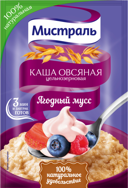Бренд-шеф Мистраль предлагает Вам попробовать аппетитную кашу-десерт «Ягодный мусс». Яркий букет из ароматных ягод земляники, нежной черники и спелой малины подарят настроение утренней прогулки по залитому солнцу летнему лесу. А цельные полезные овсяные хлопья подарят энергию и чувство сытости надолго.