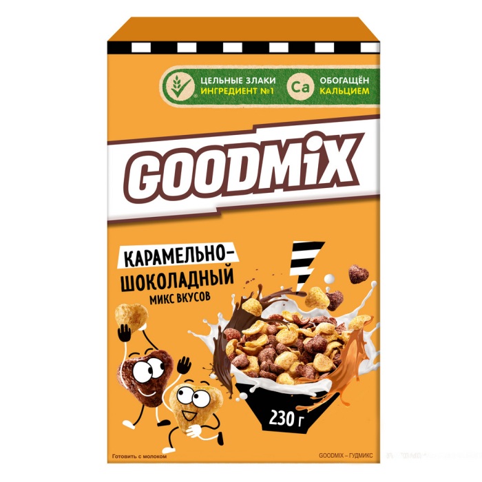 Пшеница (содержит глютен), пшеничная мука (содержит глютен), сахар, патока, масло подсолнечное, карбонат кальция, какао-порошок с повышенным содержанием жира, молоко сухое цельное, какао тёртое, соль, ароматизаторы натуральные, карамельный сироп, эмульгатор (лецитины).