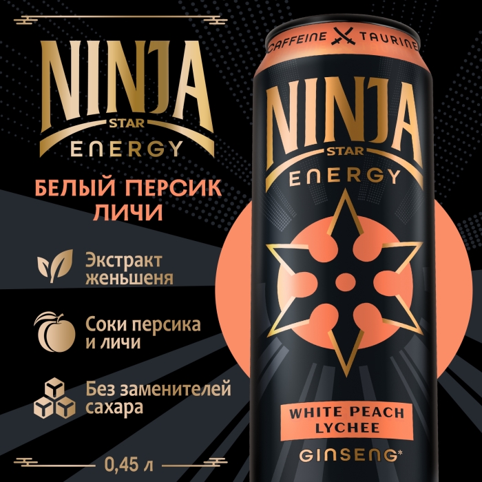 Напиток безалкогольный тонизирующий (энергетический) газированный витаминизированный «Ninja Star Energy White Peach Lychee» («Ниндзя Стар Энерджи Белый Персик-Личи»)