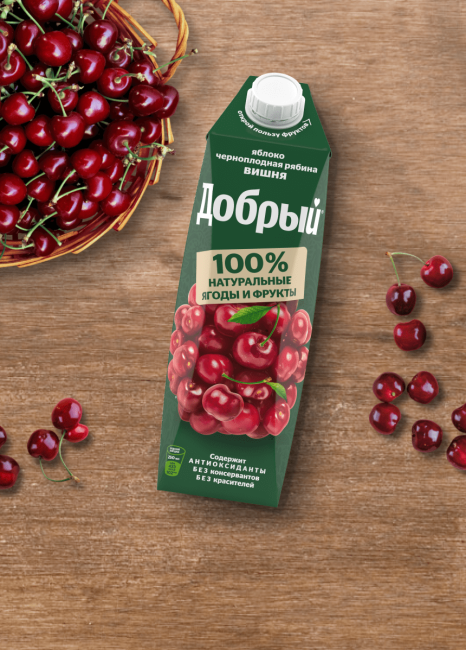 Добрый Яблоко-черноплодная рябина-вишня нектар без консервантов и красителей в удобной упаковке для семейного обеда или ужина., Упаковка продукта может быть в цветном или белом виде.