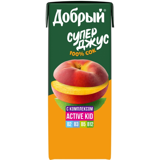 Добрый 100% сок Яблоко-Персик с витаминным комплексом Active Kid (B2, B3, B5, B12)без добавления сахара, консервантов и красителей в удобной упаковке 200 мл с трубочкой для питания ребенка раннего возраста.