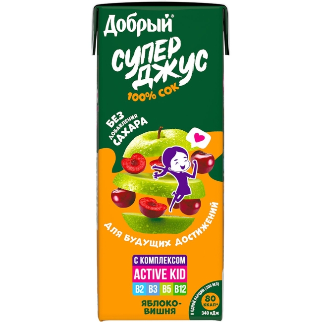 Добрый 100% сок Яблоко-Вишня с витаминным комплексом Active Kid (B2, B3, B5, B12), без добавления сахара, консервантов и красителей в удобной упаковке 200 мл с трубочкой для питания ребенка раннего возраста.