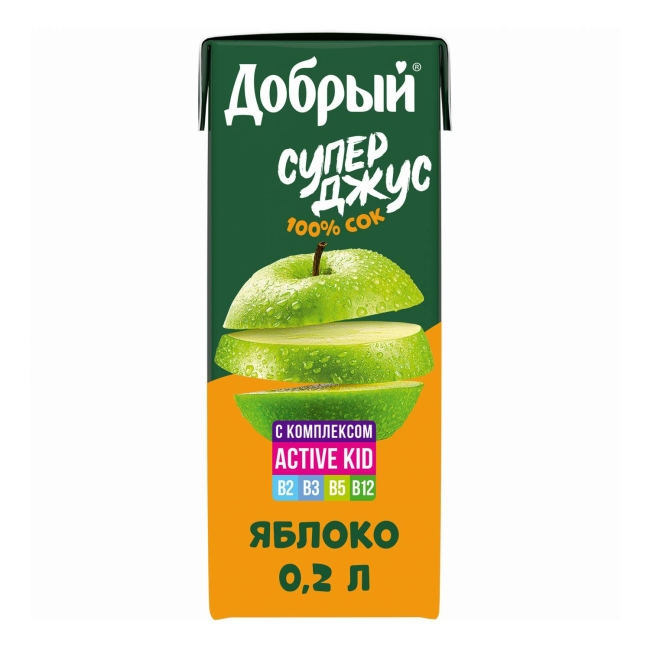 Добрый 100% сок Яблоко с витаминным комплексом Active Kid (B2, B3, B5, B12), без добавления сахара, консервантов и красителей в удобной упаковке 200 мл с трубочкой для питания ребенка раннего возраста.