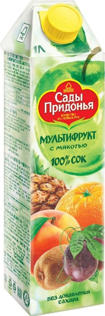 Этот сок имеет свой оригинальный вкус и характер, потому что это микс из различных фруктов: персик, киви, ананас, маракуйя, апельсин и, конечно, яблоко.