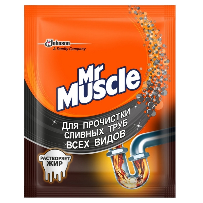 Средство для прочистки труб Mr.Muscle 70 г. Назначение. Полностью прочищает засоренные и слабо проходимые сливные трубы, устраняет неприятные запахи. Растворяет жиры, волосы и остатки пищи, не повреждая труб. Способ применения. Убрать воду вокруг сливного отверстия. Вскрыть пакетик и высыпать все содержимое в сливное отверстие раковины или ванны. После этого сразу добавить 0,5 л теплой, но не кипящей воды. Оставить на 15 минут. Затем осторожно, избегая разбрызгивания, тщательно промыть трубу хол