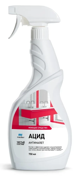 Моющее средство Чистый состав АЦИД АНТИНАЛЕТ - быстро и эффективно удаляет сильный ржавый, известковый и мыльный налет, черные плесневые пятна , убивая при этом бактерии и грибок. Удаляет очень сложные и застарелые загрязнения с сантехники , плитки, межплиточных швов и других поверхностей в ванной и туалете из различных кислотостойких материалов.