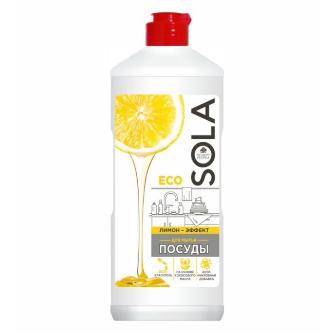 Средство для мытья посуды SOLA 500 мл от компании Ренессанс Косметик легко и эффективно отмывает посуду. Моющее средство для посуды имеет густую и концентрированную формулу, которая расщепляет засохший жир и безупречно отмывает посуду в холодной воде. Экологичное средство для посуды с биоразлагаемыми компонентами не наносит вред окружающей среде за счет отсутствия в составе опасных компонентов.
