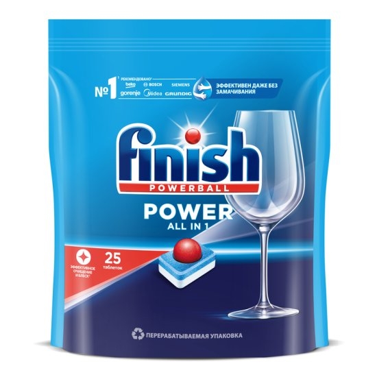 Моющее средство для посудомоечной машины Finish Power рассчитано на изделия из керамики, металла и пластика.