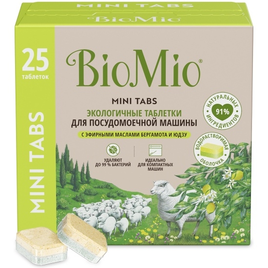 Экологичные быстрорастворимые таблетки BioMio BIO-TABS с эфирными маслами бергамота и юдзу для посудомоечных машин на 91% состоят из натуральных компонентов.
