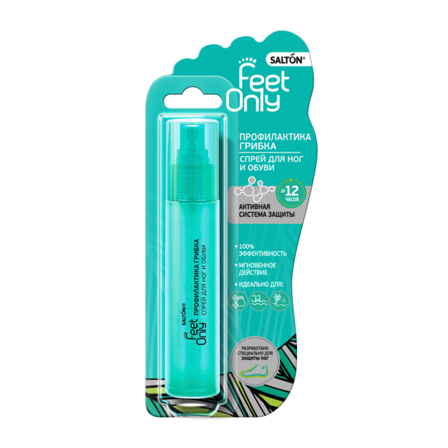 Спрей Salton Feet Only обеспечивает активную длительную защиту ног от грибковых заболеваний: он мгновенно убивает микроорганизмы, вызывающие грибковое поражение кожи стоп и ногтей, и продолжает действовать до 5 часов на коже и до