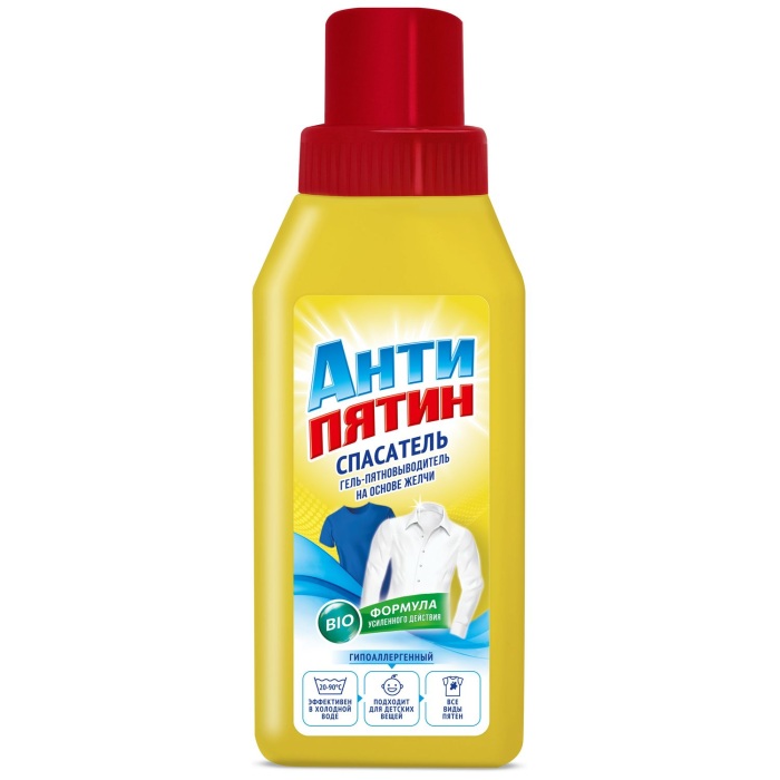 АНТИПЯТИН гель с натуральной желчью для удаления пятен.BIO-формула.Содержит активные энзимы из желчи: липазу для растворения жировых загрязнений и протеазу для растворения белковых загрязнений.Энзимы -это белки, которые ускоряют скорость химической реакции, состоят из более 20 аминокислот, каждая из которых работает со своим видом пятен.Действуют уже при низких температурах.Удаляет все виды пятен- кофе, чая, вина, фруктов, макияжа, крови, жира, пота, чернил, фломастеров, гелевой ручки и ржавчины