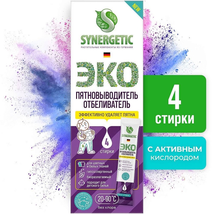 Биоразлагаемый гипоаллергенный отбеливатель-пятновыводитель с активным кислородом SYNERGETIC в стиках – универсальное средство для эффективного удаления загрязнений и трудновыводимых пятен от масла, жира, какао, ягод, травы, чернил, кофе, вина, крови на ц