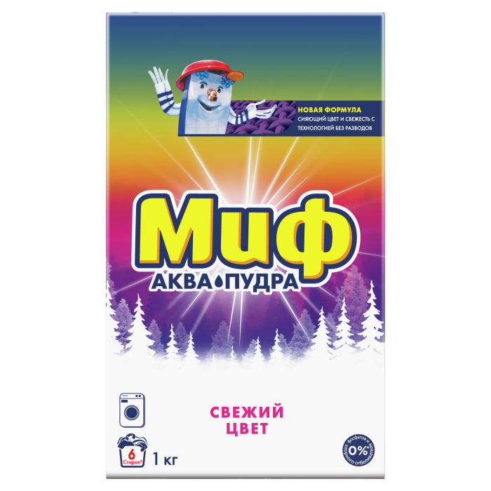 Стиральный порошок Миф Свежий цвет Автомат для стиральных машин предназначен для стирки цветного и белого белья. Порошок для стирки Миф Свежий цвет отлично очищает и удаляет пятна, сохраняет яркие цвета и придает вещам приятный свежий аромат. Благодаря технологии Аквапудра, Миф Свежий цвет мгновенно растворяется при контакте с водой и хорошо выполаскивается. Только сияющая чистота и свежесть!