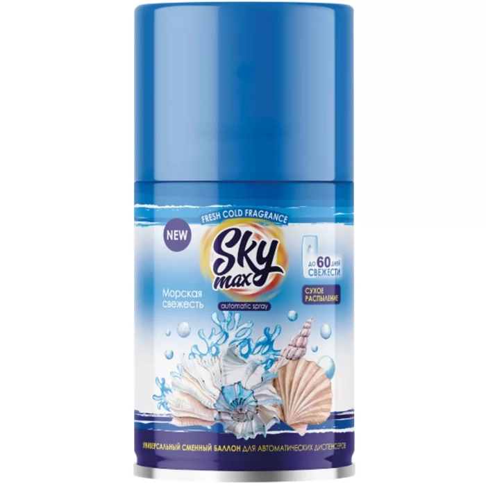 Сменный баллон для автоматического освежителя Sky Max Морская свежесть 250 мл. Назначение: предназначен для использования в качестве сменного баллона в автоматических освежителях воздуха соответствующей конструкции. Баллон можно использовать, как отдельно от диспенсера, так и в качестве сменного блока. Меры предосторожности: Огнеопасно! Баллон под давлением. Не устанавливать вблизи источников тепла, огня или искр, электрического оборудования и под прямыми солнечными лучами - в любых местах, где