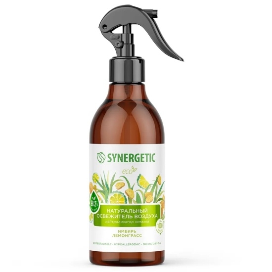 Биоразлагаемый освежитель воздуха, нейтрализатор запахов SYNERGETIC Имбирь и лемонграсс на водной основе на 98,2% состоит из натуральных компонентов. Парфюмерная композиция с эфирными маслами имбиря, бергамота и лемонграсса наполняет воздух ярким цитрусовым ароматом. Гипоаллергенная формула безопасна для людей и животных.