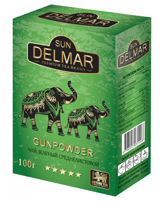Познакомьтесь с Sun Delmar GUNPOWDER — зелёным чаем, который превращает каждое чаепитие в особенное удовольствие. Этот чай изготавливается из лучших зелёных чайных листьев, скрученных в характерные шарики, что придаёт напитку насыщенный вкус и аромат.