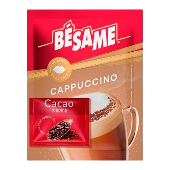 сахар, заменитель сливок на основе растительного жира(глюкозный сироп, растительный жир, обезжиренное сухое молоко, молочный белок, стабилизаторы(Е340ii. Е452i), эмульгаторы, (Е471, Е481), агент антислеживающий(Е551), регулятор кислотности (Е451i), кофе натуральный растворимый, соль, араматизаторы: какао-посыпка, "Какао поппинг"(сахар, какао-порошок, агент антислеживающий(Е551 ). Пакетик с дополнительным компонентом(Какао-посыпка) прикреплен к порционной упаковке