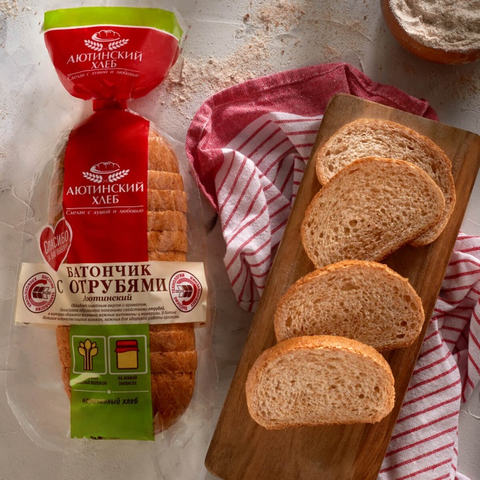 Батончик выпечен из муки первого сорта с добавлением пшеничных отрубей, что делает его вкус особенно изысканным. Обладает приятным вкусом и ароматом. Польза батона обусловлена полезными свойствами отрубей, в которых содержатся жизненно важные витамины и минералы. В батоне большое количество пищевых волокон, важных для здоровой работы организма. Подходит для постных дней, для людей с нарушением функций обмена веществ.