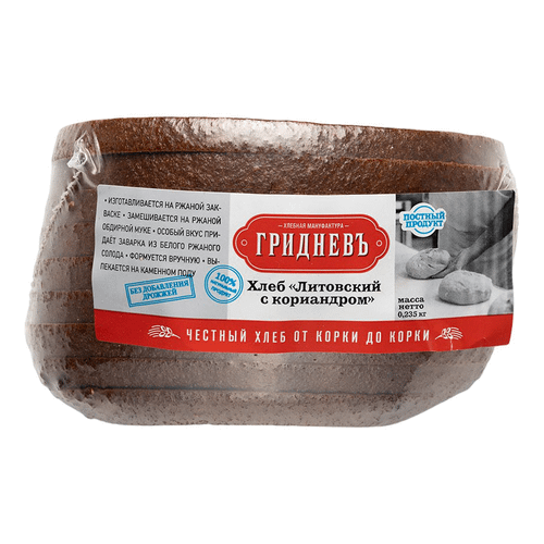 Плотный ржано-пшеничный мелкопористый хлеб на заквашенной ржаной заварке с добавлением зерен кориандра. Выпекается на каменном поду. Замешивается на закваске без добавления дрожжей. Изготавливается и формуется вручную. Постный продукт. Без сахара. За счет плотного мякиша “Литовский с кориандром” может стать отличной “съедобной тарелкой” для различных салатов и всевозможных начинок.