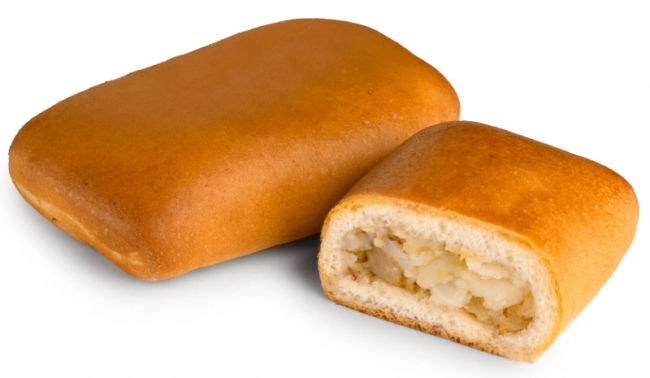 мука пшеничная хлебопекарная в/с, начинка (картофель, лук репчатый, масло растительное подсолнечное, соль, перец черный молотый), вода питьевая, сахар, масло растительное подсолнечное, маргарин столовый (рафинированные дезодорированные растительные масла, вода, соль, пищевая добавка: эмульгатор лецитин), яйцо куриное пищевое, дрожжи хлебопекарные, соль.